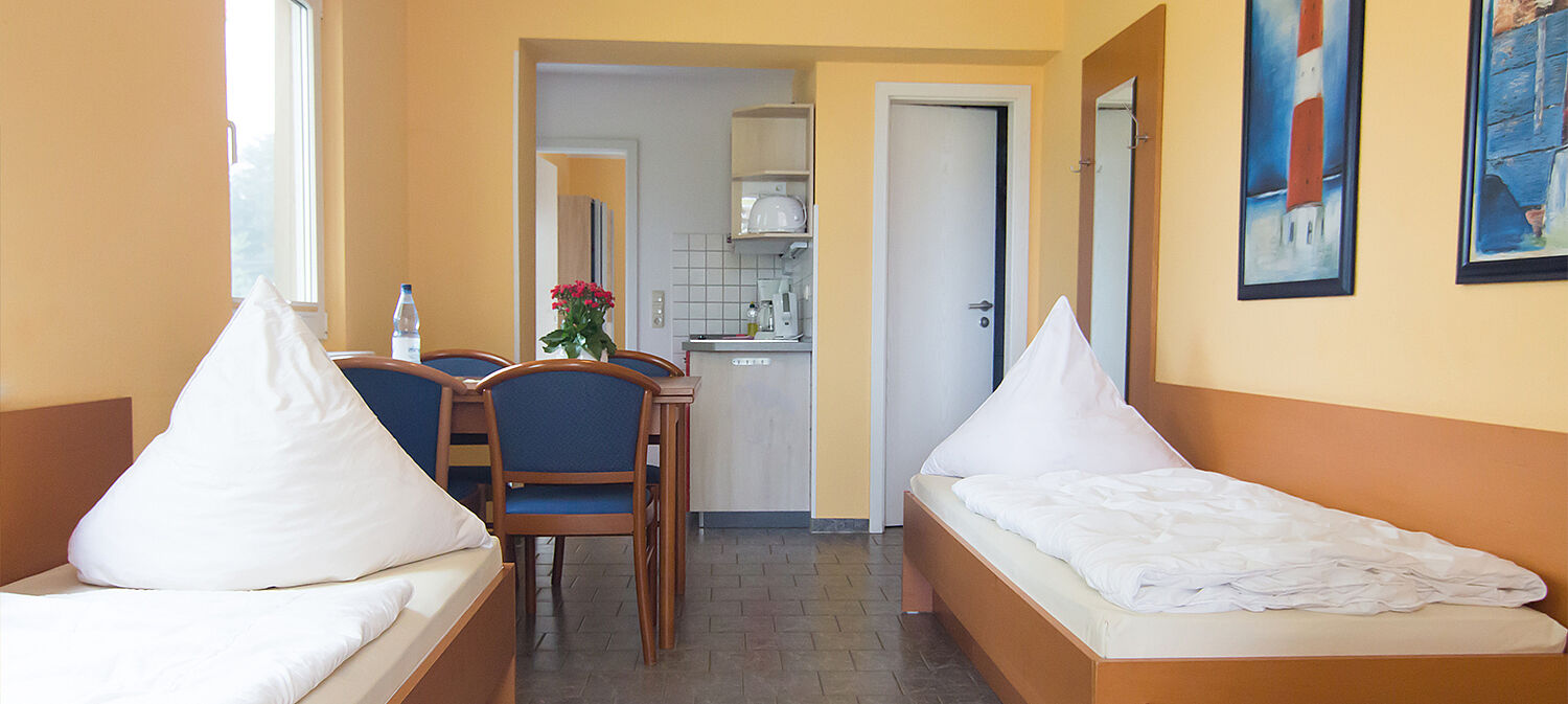 1 Doppelbett im Schlafzimmer, 2 Einzelbetten im Wohnbereich (Matratzenbreite: je 90 cm)