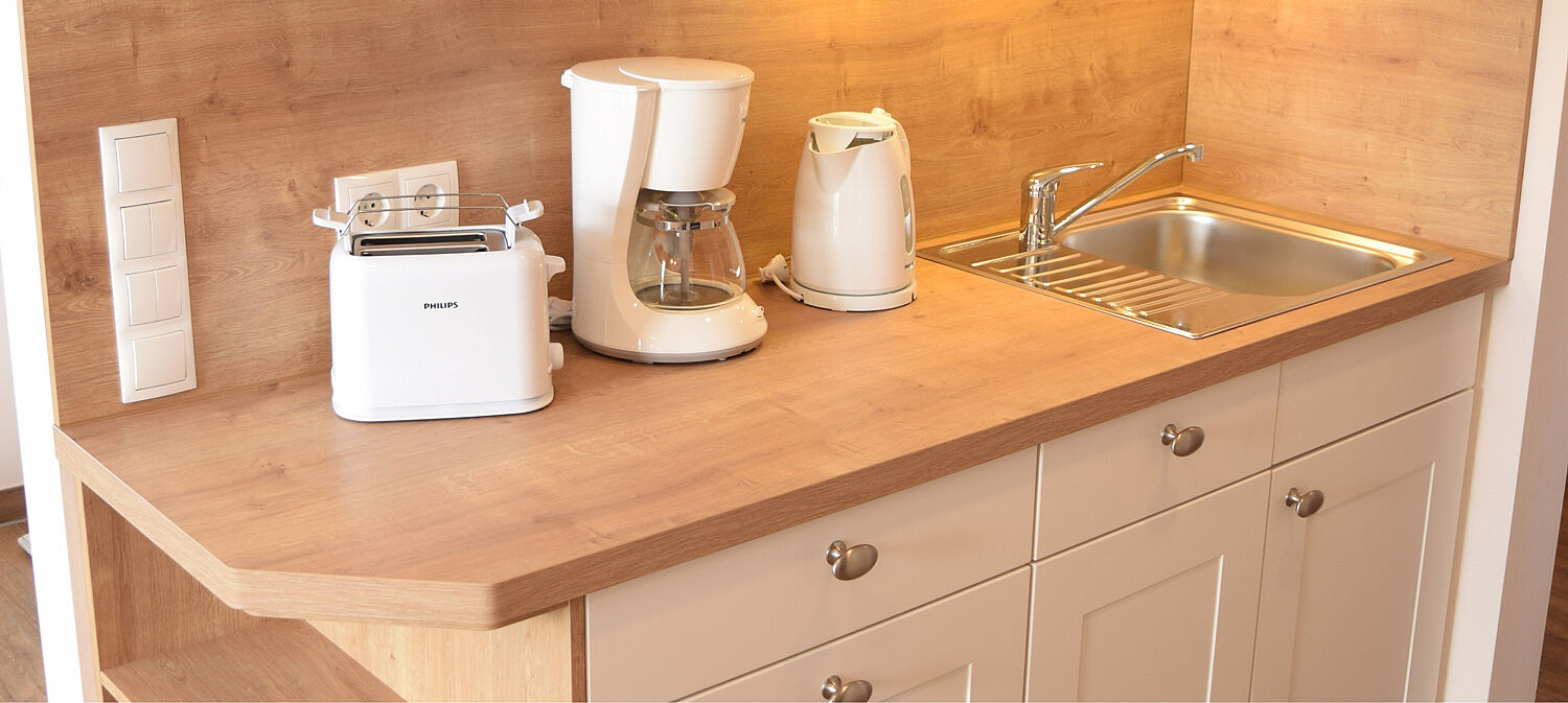 SAT-TV, Badezimmer mit Dusche und WC, Küche mit Kühlschrank, Spüle, 2 Kochplatten, Kaffeemaschine, Wasserkocher, Toaster und Geschirr, sowie eine elektrische Heizung gehören zur Grundausstattung der Wohnungen.